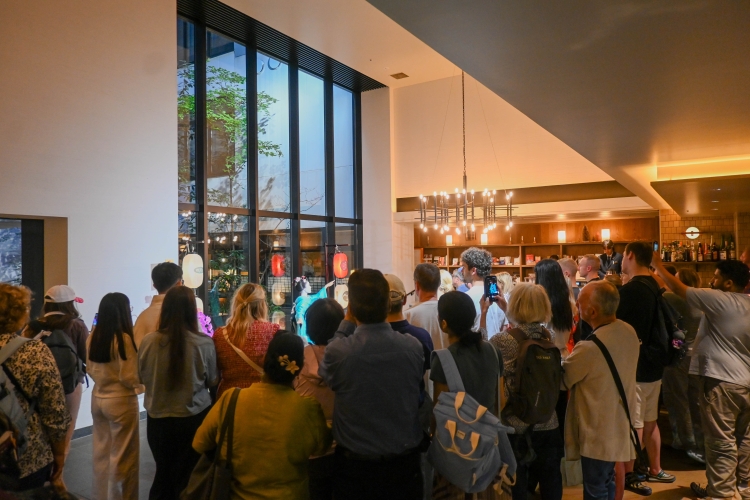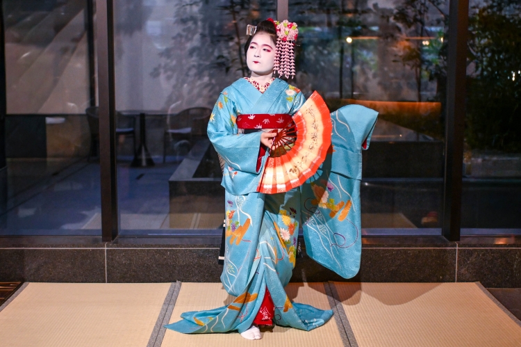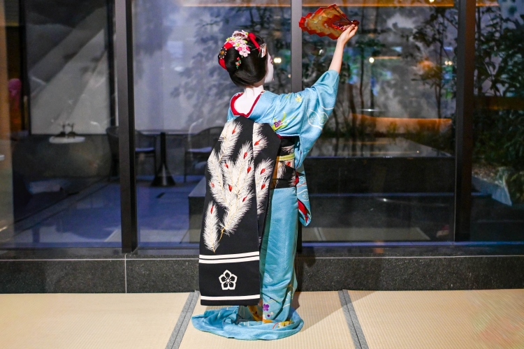 L'événement s'est déroulé dans le hall de HOTEL RESOL TRINITY KYOTO. L'espace, recouvert de tatamis, évoquait un salon de thé japonais traditionnel. Des maikos sont apparues au son doux des shamisen et des flûtes.