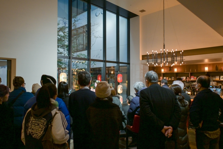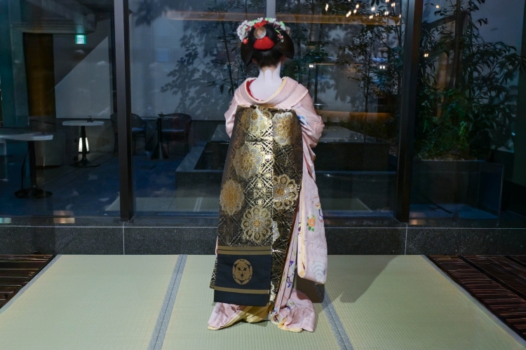 L'événement s'est déroulé dans le hall de HOTEL RESOL TRINITY KYOTO. L'espace, recouvert de tatamis, évoquait un salon de thé japonais traditionnel. Des maikos sont apparues au son doux des shamisen et des flûtes.